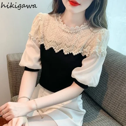 Contrast Color Blusas De Mujer Short Sleeve O-neck Blouses for Women Patchwork Lace Beading Tops Puff Sleeve Sweet Summer Shirts