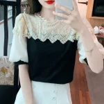 Contrast Color Blusas De Mujer Short Sleeve O-neck Blouses for Women Patchwork Lace Beading Tops Puff Sleeve Sweet Summer Shirts